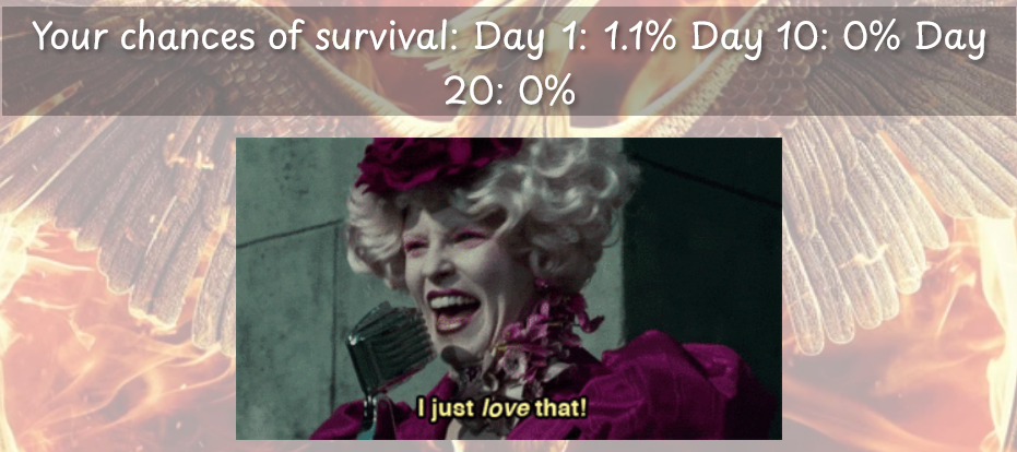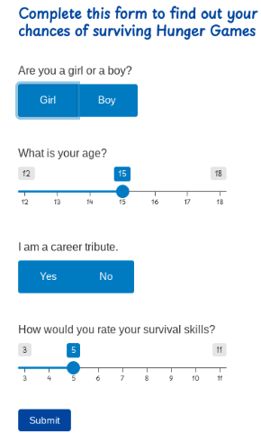 tagList(# sexradioGroupButtons(inputId ="sex",label ="Are you a girl or a boy?",choices =list("Girl"= 1L, "Boy"= 0L),status ="primary",selected =character(0) ),# agesliderInput(inputId ="age",label ="What is your age?",min =12,max =18,value =15,step =1 ),# careerradioGroupButtons(inputId ="career",label ="I am a career tribute.",choices =list("Yes"= 1L, "No"= 0L),status ="primary",selected =character(0) ),# ratingsliderInput(inputId ="rating",label ="How would you rate your survival skills?",min =3,max =11,value =5,step =1 ))